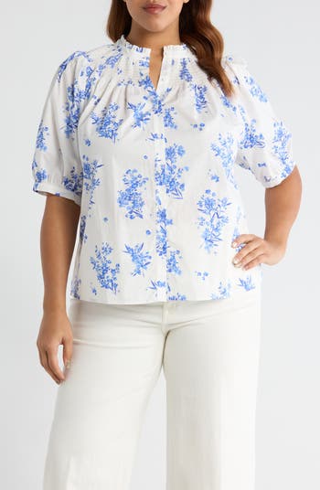 Smocking at the yoke brings easy texture to this crisp cotton button-up bursting with blooms.