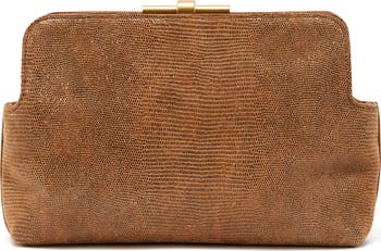 Finely embossed leather and a geometric profile distinguish a striking frame clutch featuring an optional chain strap for hands-free wear.