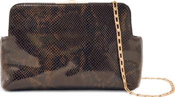 Glinting hardware and smooth leather highlight the geometric profile of a slender frame clutch featuring an optional chain strap for convenient hands-free wear.