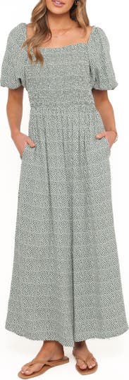 Smocking at the bodice shapes this lightweight wide-leg jumpsuit covered in a playful print and perfect for a sunny picnic day.