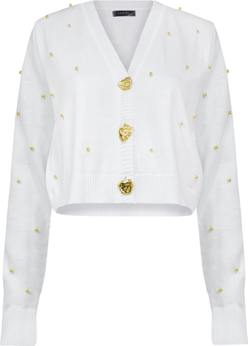 This versatile sweater combines sophistication and functionality in a semi-cropped silhouette with a V-neckline, ideal for elevating any casual look. The central gold buttons and delicate metallic appliqués add a touch of sparkle and distinction without losing subtlety, making it a key piece for a refined and contemporary style.