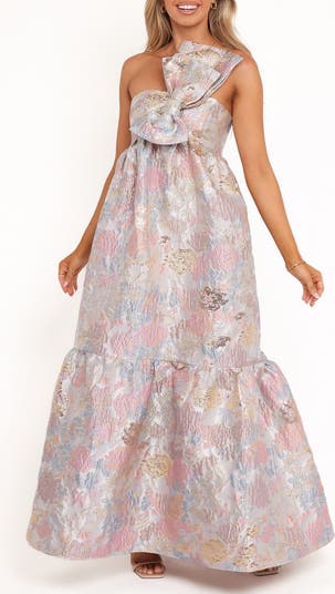 All about the drama, this strapless maxi dress makes every entrance memorable with a sideways bow in the front and a shimmery jacquard pattern all over.