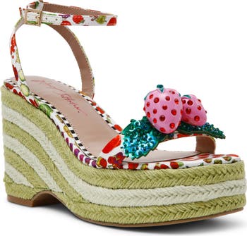 Two-tone stripes highlight the lofty platform wedge of this vacation-ready sandal topped with an ankle strap and sparkling strawberry embellishments.