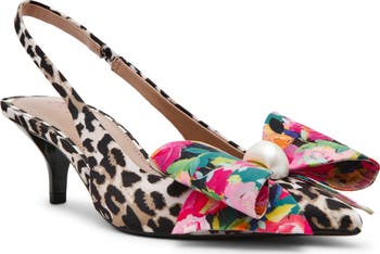 Eclectic patterns make a bold, colorful statement on a pointy-toe pump embellished with a pearly bead.