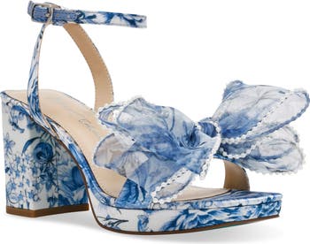 Pearly beads trim a tulle vamp bow on a floral-patterned slide sandal lofted by a slight platform and wrapped block heel.
