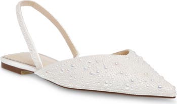 Colorful rhinestones shimmer and shine on a glamorous satin flat fashioned with a pointy toe and slingback strap.