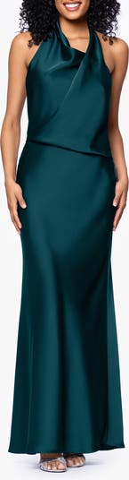 A drapey bodice adds dimension to this figure-skimming gown cut from glossy satin and meant to show off your shoulders and back.