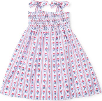 Bodice is made of stretchy smocked woven pima cotton. Dress has tie straps. Made from 100% Peruvian Pima Cotton.