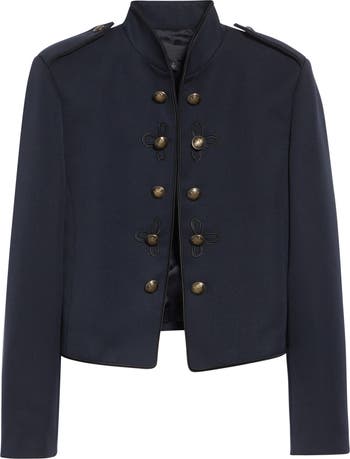 Report for duty in a military-inspired jacket made from virgin wool and lined with burnished buttons.