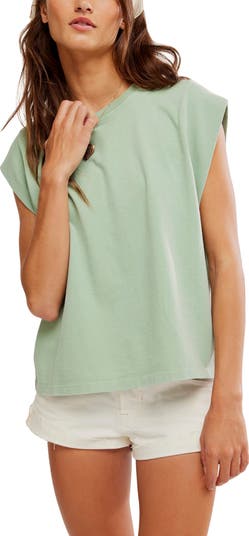 Finally a tee for the gym that doesn't show everything. Heavy weight cotton, cap sleeves that are open down to just about your bra and the shirt length seems to hit near the hips. A bit boxy but does show some shape. Nice colors so I bought both and wore it to the gym already although it would work for out and about or layered. This one is not oversized like many of their tops so I suggest ordering for your usual size.