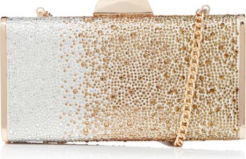 Lustrous jewel embellishments underscore the glamorous appeal of an evening-ready frame clutch outfitted with an optional chain strap for hands-free wear.