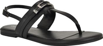 Signature logo hardware highlights the sleek faux-leather upper of a minimalist sandal featuring a center toe post and adjustable slingback strap for a secure fit.