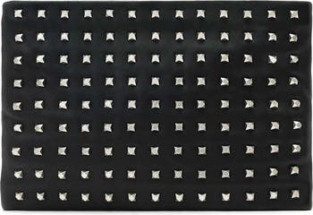 Faceted studs bring an edgy attitude to a slender leather clutch perfect for accessorizing your night-out looks.