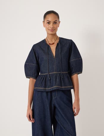 Sculpted barrel sleeves meet a softly gathered peplum and a tie neckline, creating an easy feminine silhouette that moves beautifully from market mornings to sunset dinners.