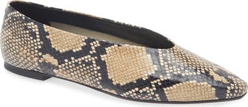 A streamlined topline softly curves near the front while a pointy toe is subtly squared at the tip to add modern distinction to this snakeskin-print leather flat.