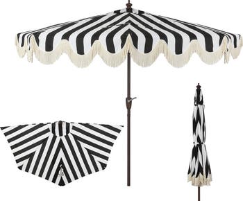 This classic umbrella is the life of the party with its scalloped edges and iconic stripes. The sturdy aluminum frame is covered in durable outdoor canvas and includes a manual tilt mechanism that can block the sun from the left or right. Trimmed in bullion fringe, this umbrella adds designer style to the patio, pool or dining area.