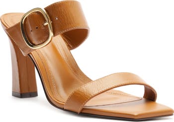 A buckled instep strap offers a secure and customized fit on a leather slide sandal balanced by an angular square toe and slender block heel.