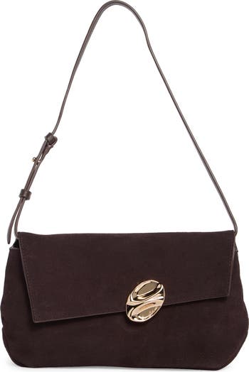 Polished logo hardware adds a sophisticated flourish to a compact clutch furnished with an adjustable shoulder strap for hands-free convenience.