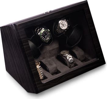 A transparent glass top covers a high-lacquer ash-wood watch case to keep your watch collection stored and on display. The four-watch winder feature will keep your watches timed precisely.