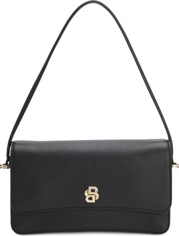 Glinting logo hardware and richly textured leather highlight the clean lines and structured profile of a sophisticated shoulder bag suspended from a single strap.