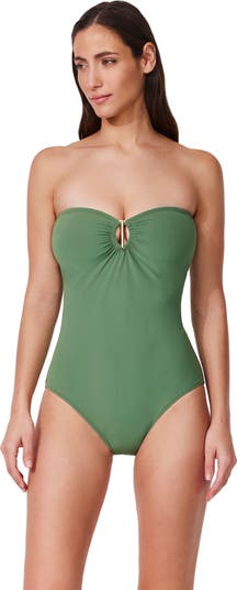 Make a bold statement in the Beyond Time Bandeau One Piece. With a keyhole design and matte gold insert at the bust, this swimsuit features built-in soft cups, adjustable/removable straps, tummy control, and full front and back lining. For the perfect fit, we recommend sizing up one size.