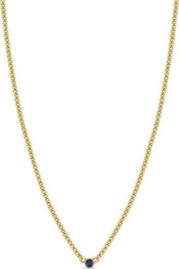 This stackable 14-karat-gold necklace is centered by a single bezel-set blue sapphire.