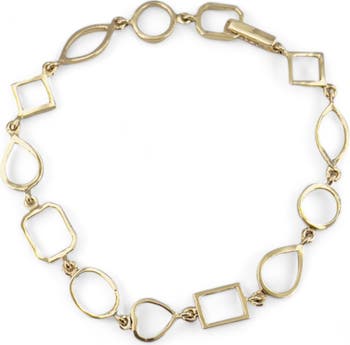 This 14-karat-gold bracelet is given geometric shape with open bezels.
