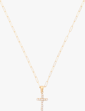timeless meets everyday with this classic cross necklace. A 16"" 14k gold filled paperclip chain with a gold PVD stainless steel cross with cubic zirconias bezel set.