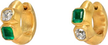 A round-cut diamond and emerald-cut emerald in vintage-inspired bezel settings illuminate a pair of huggie hoops crafted in the USA from gleaming 18-karat gold. A brushed satin finish adds to their glamorous appeal.