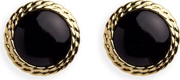A rope-textured bezel plated in 18-karat gold houses a glossy semiprecious stone in stud earrings imbued with timeless shine.