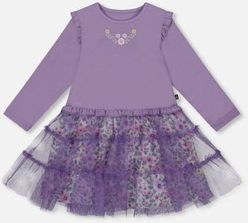 Twirl into a world of charm with the Bi-Material Dress With Muslin & Mesh Skirt Purple Gray! Crafted from organic cotton with a soft jersey bodice with delicate flower details around the neckline, this frock features a whimsical mesh skirt layered over a soft floral muslin base for a playful, textured look. The long sleeves and round neckline add a cozy touch, while the ruffled mesh skirt at the bottom adds a fun, feminine flair. Ideal for any occasion, this dress is a perfect pairing with any tights from our “Frost Flowers” collection.