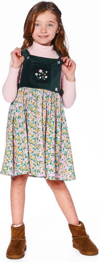 Effortlessly charming, the Bi-Material Overall Dress in Green With Flower Print is a playful pick for stylish fall days. This rib velour overall dress features a solid green top with a front patch pocket and floral embroidery, paired with a lightweight viscose skirt in an allover floral print. Adjustable straps add comfort and twirl-worthy volume for every adventure.