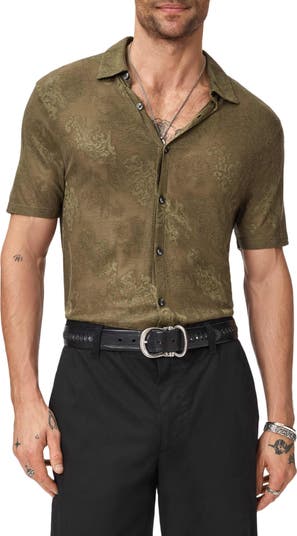 Jacquard tapestry patterns float against the semisheer mesh of a shirt designed for warm, breezy days and nights that have the potential to get hot. Wear it tucked or untucked and unbuttoned as you dare to change up your look without losing a moment of attention.