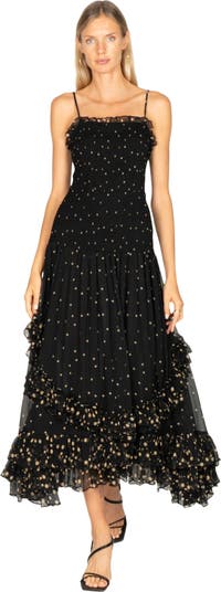 Secret Mission’s Bianca Maxi Dress is crafted from 100% silk chiffon in the signature mixed polka dot print. Designed with a smocked bodice and slim adjustable straps, it fits closely through the bust while falling into a flowing, vintage-inspired skirt with ruffled detailing. This maxi dress combines elegance with ease, offering graceful movement and a romantic silhouette.