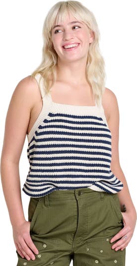 - Shaker stitch body, rib neck, straps, and hem