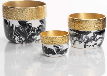 The Bianco Nero Cache Pots make a bold statement with their striking contrast of black and white enamels, finished with luxurious goldplating. The porcelain-like luminescence of these cache pots adds a touch of modern elegance to any space, while their timeless design ensures they complement both contemporary and classic interiors. Perfect for showcasing plants or as decorative accents, these pots bring a sophisticated edge to your décor.