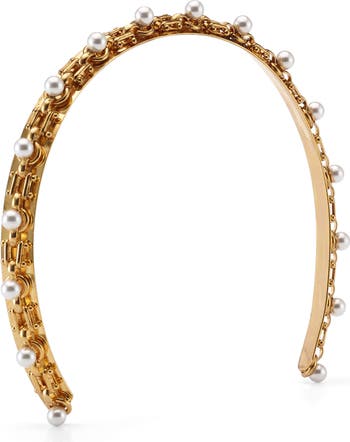 Add bright shine and a luminous glow to your hairstyle with this crown-inspired headband made of polished metal and smooth faux pearls.