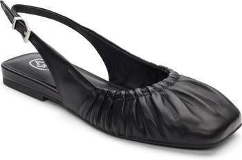 Gathered detailing adds a softly sculptural touch to a flat shoe fixed with an adjustable strap.