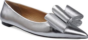 An exaggerated bow adds a fun, contemporary flourish to a pointy-toe flat shaped from smooth leather.