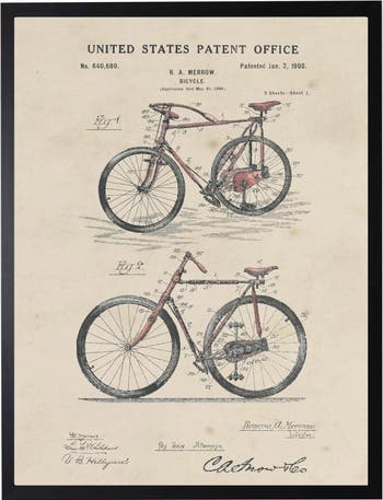 This vintage-inspired print, framed in a black wooden frame, features a bicycle patent. Sized at 16 inches by 20 inches, this made in the USA frame makes for a beautiful addition to any wall.