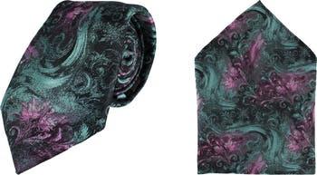 Elevate your formal attire with the Big and Tall Arcane Storm Silk Tie and Pocket Square Bundle. This exquisite set features a striking necktie adorned with sweeping green waves and regal pink blooms, complemented by a matching pocket square that showcases a floral swirl design. Both pieces are crafted from premium silk and woven with lustrous metallic threads, making them perfect for weddings, galas, or any occasion where you want to make a bold statement. Tie measures 3 x 63 inches and pocket square is 12x12 inches.