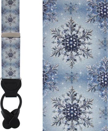 Celebrate the season with refined elegance in the Clarence the Classy Snowflake Braces, exquisitely tailored for the distinguished gentleman. Crafted from the finest silk, these braces feature an opulent design of intricate, crystalline snowflakes set against a shimmering blue ground, capturing the quiet beauty and sophistication of a winter's evening. Specially designed in Big & Tall proportions, Clarence ensures a flawless fit and superior comfort without compromising style. The genuine leather button end and polished nickel fittings add timeless durability, while the silk's lustrous sheen enhances the festive motif with subtle luxury. Perfect for holiday soirees, black-tie gatherings, or seasonal celebrations, these braces are a sartorial expression of both festive charm and dignified taste. Braces are adjustable from 38 to 55 inches long and are 35mm or 1 3/8 inches wide.