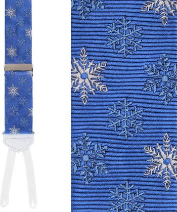 Step into the season of celebration withBig & Tall Let It Snow Brace, exquisitely woven from the finest silk. Against a rich winter-blue backdrop, delicate snowflakes shimmer in silvery tones, evoking the crisp elegance of a snowy evening. The motif captures the timeless beauty of winter, bringing both festive charm and refined sophistication to your holiday attire. Specially designed in Big & Tall proportions, Let It Snow ensures a flawless fit and superior comfort without compromising style. Crafted with formal end fastenings, these braces are designed for the gentleman who values tradition, luxury, and lasting quality. Genuine leather details and polished nickel hardware ensure both durability and elegance, while the lustrous silk provides a smooth, refined drape. Perfect for black-tie gatherings, winter weddings, or festive soirees, the Let It Snow braces are a distinguished finishing touch for the season. Braces are adjustable from 38 to 55 inches long and are 35mm or 1 3/8 inches wide.