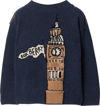 A sweater in speckled wool with contrasting shoulder seams. The style is intarsia-knitted with an illustration of Big Ben and a Burberry flag. ||Rib-knit trims|Embroidered Burberry lettering at flag