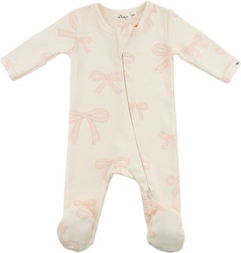 Made with super soft cotton, this two-way zipper footie features adorable pink bows on a subtle milk-colored background. This footie has extra attention to detail with its convertible mitts, covered zipper top and cozy lined feet. Designed in Minnesota. Available in infant sizes.