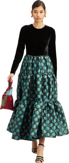 Demure black velvet on the top, voluminous on the bottom, the Big Dress is born from our best-selling Big Skirt and has all the same flouncy va-va-voom. With its four-tiered, ankle-sweeping skirt, this is the kind of number you reach for when you want to really make an entrance - think twilight cocktails before moving onto the Teatro Scala. Match this decadent Winter Sun jacquard fabric with lashings of black eyeliner and an enchanting air of mystery.