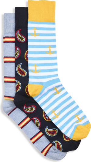 One if by land; two if by sea and three, well...because you can never have enough pairs of novelty socks. This 3-pack set of moisture-wicking, Italian-made socks are the perfect footnote for any look. Designed at DXL for Big and Tall guys, they are crafted in a soft, yet durable, cotton/nylon blend with a touch of spandex for comfort. The ribbed top helps them stay in place on the legs and prevents sliding. The set includes a striped pair, a pair with anchors and one with a paisley pattern.