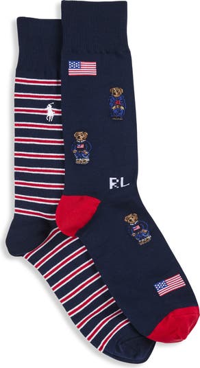 A knit-in mini Americana bear and the American flag accent one pair of these moisture-wicking cotton-blend socks in this two-pack set, while the other pair features a striped motif. They're finished with contrast heel and toe details, making this 2-pack set the perfect footnote for all your Polo Ralph Lauren styles.