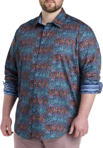 An interesting pattern play of texture and color gives this sport shirt its eye-catching appeal. Crafted in a cotton and spandex blend that allows for the freedom to move without restriction, it's designed with precise proportions and an ideal fit for Big and Tall guys. Complete with the artistry, quality and attention to detail that you'd expect from Robert Graham, it's finished with a a contrast #WearableArt print – just pop the collar and turn back the cuffs to show it off.