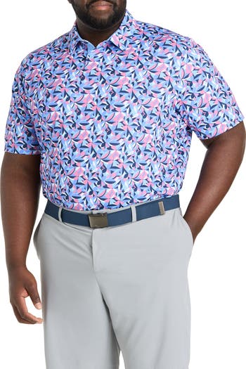Elevate your on-course style with this Callaway golf polo. Crafted from a comfortable single-knit fabrication with a thoughtful blend including recycled polyester, it ensures exceptional performance. Experience unhindered movement thanks to the integrated stretch fabric and Swing Tech™ technology. Moisture-wicking technology actively pulls moisture away from your skin to keep you dry, while UPF 50 sun protection shields you from harmful rays. Featuring an eye-catching all-over dogwood floral geometric print pattern, a classic self-collar and easy care construction, this short-sleeve style seamlessly combines innovation and authentic style for every swing.